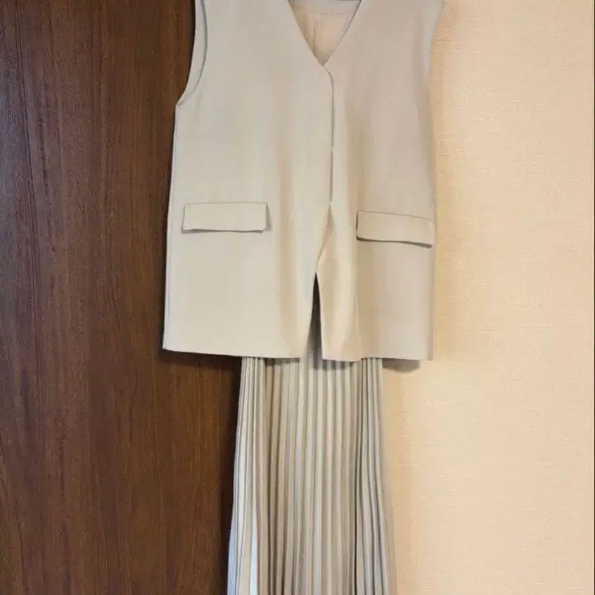 미라 오웬 베이지 슬리브리스 베스트 플리츠 스커트 셋업