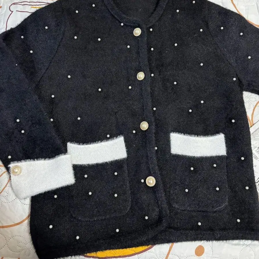 펄 장식 블랙 앤 화이트 가디건