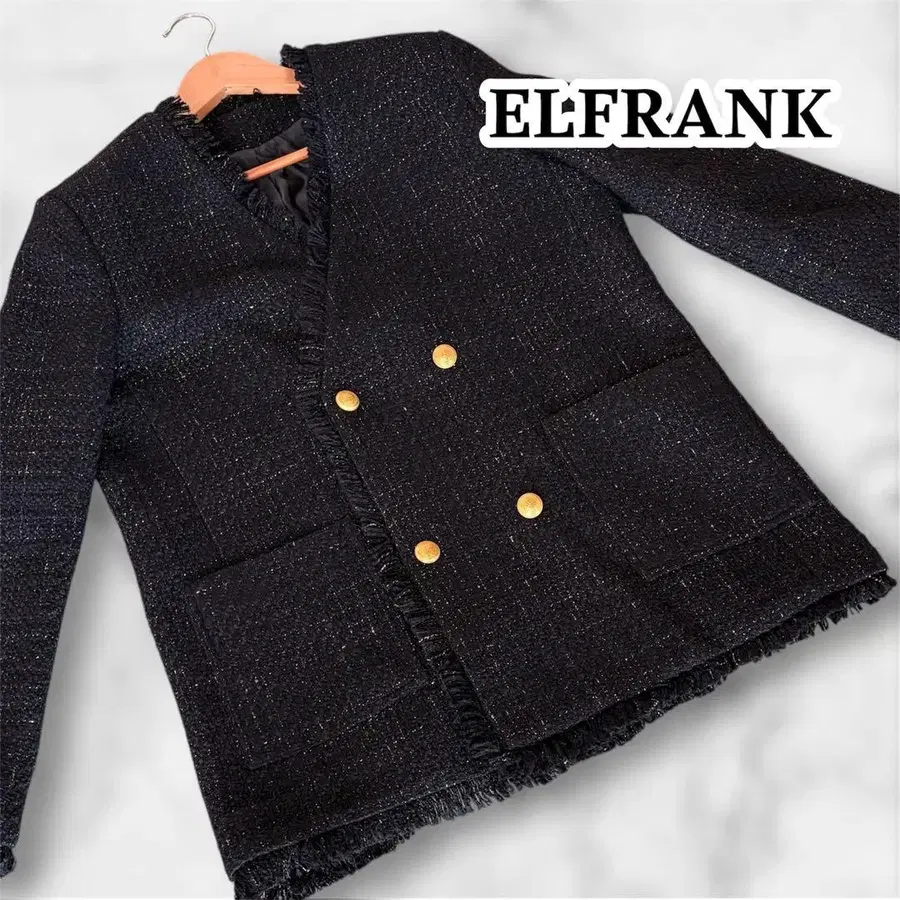 엘프랭크 EL FRANK 트위드 프린지 노카라 자켓 블랙