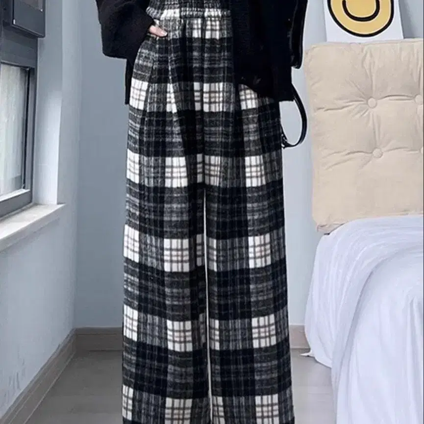 me Jane 기모 마드라스 체크 와이드 실루엣 팬츠
