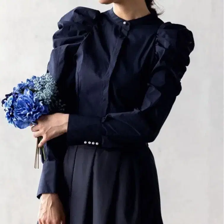 적당한 탄력이 있는 소재를 살려, 턱과 개더로 입체적으로 완성한 볼륨 슬리브가 포인트.
