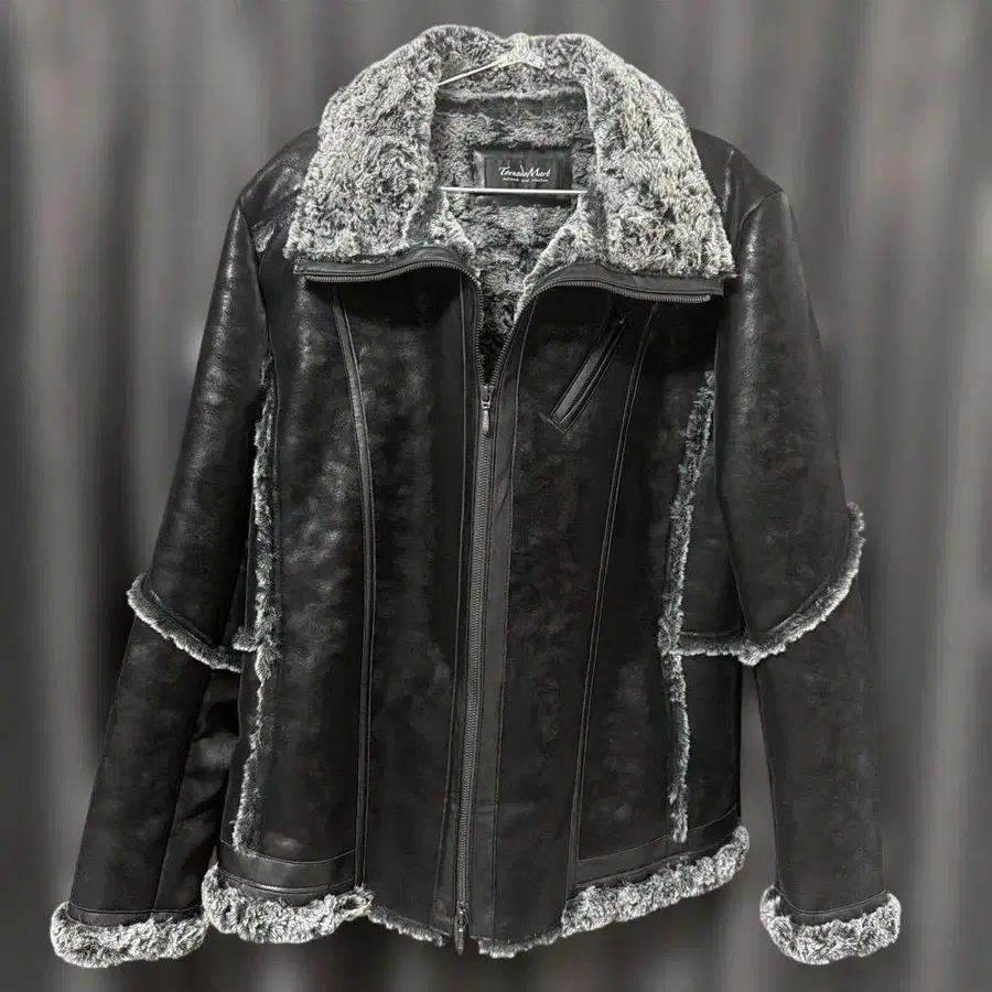 토네이도 마트의 마이크로 퍼 본딩 블루종입니다. 마이크로 퍼 페이크 무스탕을 사용한 스탠드 지퍼 블루종.