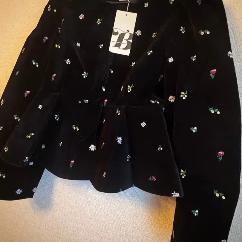 미사용 새상품 Bibiy. 25AW 컬렉션을 위해 새로 그린 오리지널 꽃무늬 자수를 고급스럽게 더한 컬렉션입니다. 고급 벨벳 원단에 5종류의 꽃과 [B] 이니셜을 섬세하게 자수하여 달콤함을 적절히 억제한 세련된 디자인으로 완성했습니다. 색상 배치와 [B]의 형태에도 신경 썼으며, 일부에 실버 라메 실을 짜 넣어 고급스러운 빛깔을 더했습니다. 적당히 컴팩트하고 입체적인 형태는 심플한 코디에 깊이를 더해주는 존재감. 자수 자체의 디자인도 차분한 인상으로 마무리했습니다. 소매와 밑단은 은은한 리브 사용으로 전체적인 균형을 아름답게 정돈했습니다. 25AW다운 페미닌하고 엘레강트한 무드를 구현한, Bibiy.만의 코다와리가 담긴 한 장입니다. 소재 겉감: 나일론 55%, 폴리에스테르 45% 그 외 소재: 나일론 50%, 폴리에스테르 50% 안감: 폴리에스테르 100% 사이즈: F 어깨 너비 가슴둘레 허리 소매 길이 56 35 100 90 69 사이즈 - FREE SIZE