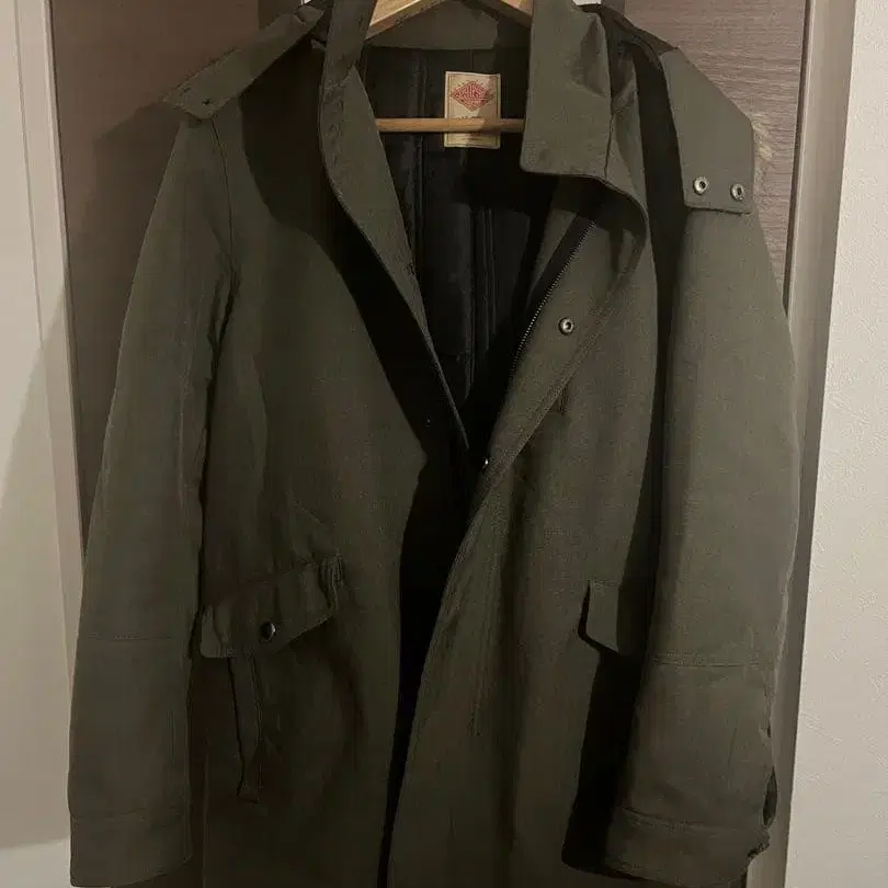 올리브색 퍼가 달린 모즈 코트, 안쪽 나일론, 앞면에 2개의 포켓.