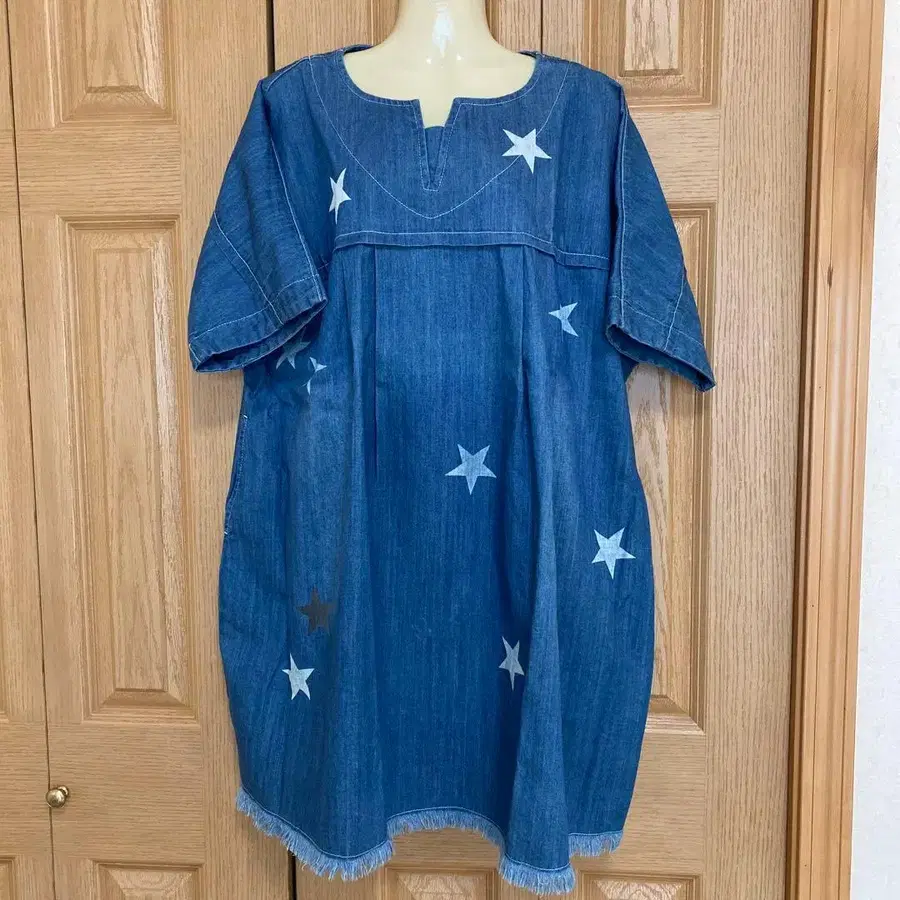 J.brauche 데님 블루 별 패턴 자수 튜닉 반팔
