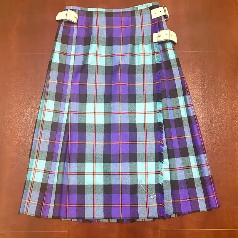 자동 번역되었어요. 원문보기보라색과 스카이블루 체크 무늬 플리츠 스커트, 화이트 벨트 포함.