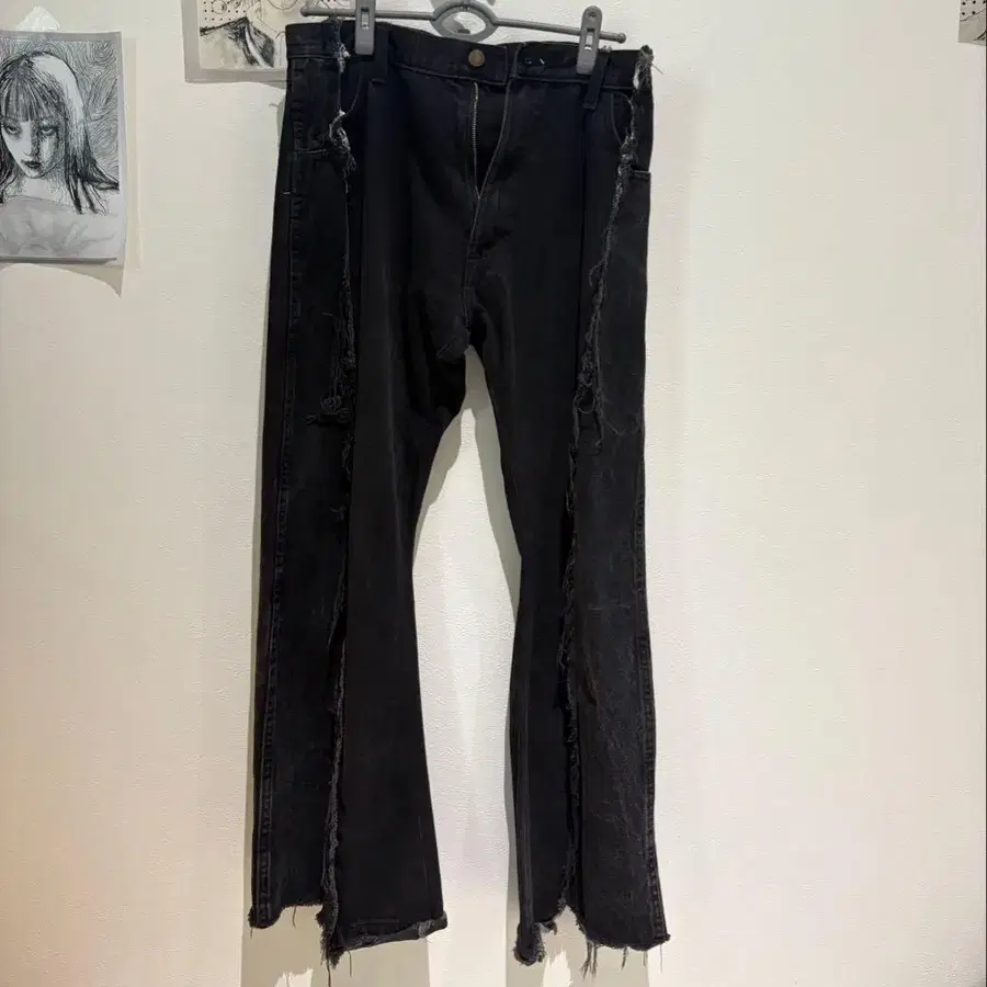 리메이크 블랙 프린지 부츠컷 데님 플레어 팬츠