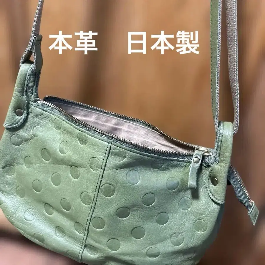천연 가죽 숄더백 사선 가능 그린 x 도트 무늬 정가 13580엔