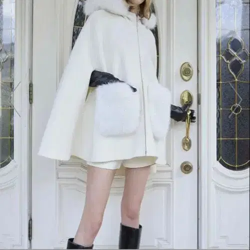 eimy 퍼 포켓 스캘럽 망토 코트