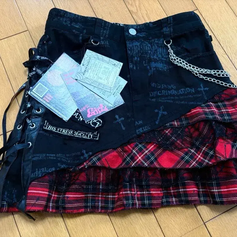 자동 번역되었어요. 원문보기레드와 블랙 체크 무늬 플레어 스커트, S 사이즈, 코튼 소재, 체인 디자인.