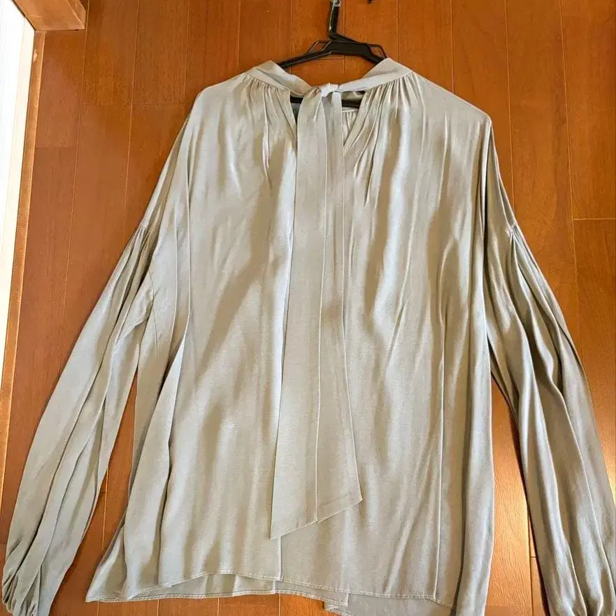 리본 포함 라이트 그레이 긴팔 블라우스