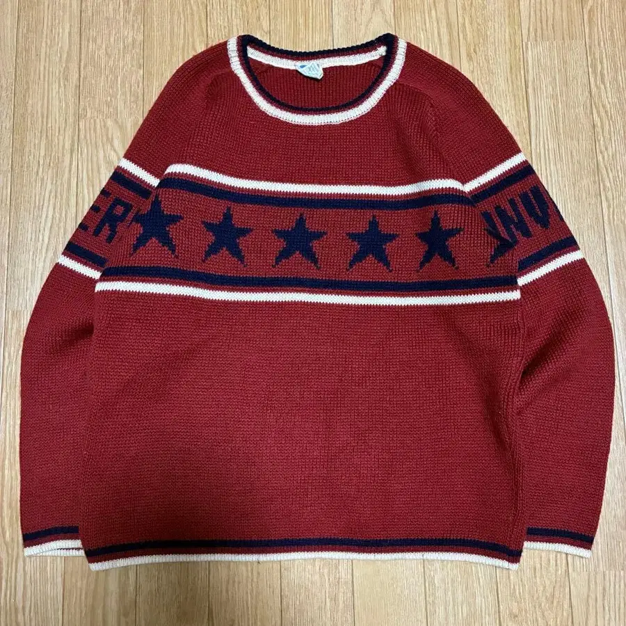 빨간색을 기조로 한 니트 소재로, 별 패턴이 특징입니다. 크루넥 스타일은 다양한 코디네이트에 맞추기 쉽습니다.