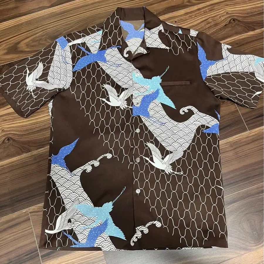 하와이안 셔츠 파도와 새 패턴 반팔 브라운 (오키나와 구매)