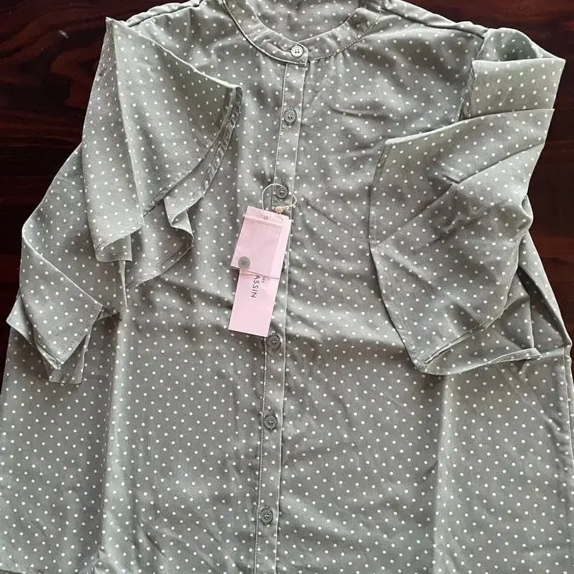도트 무늬 프릴 소매 셔츠 그린 여성용 택 포함
