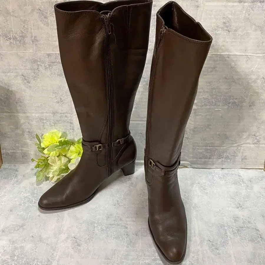브라운 가죽 롱 부츠 중간 힐