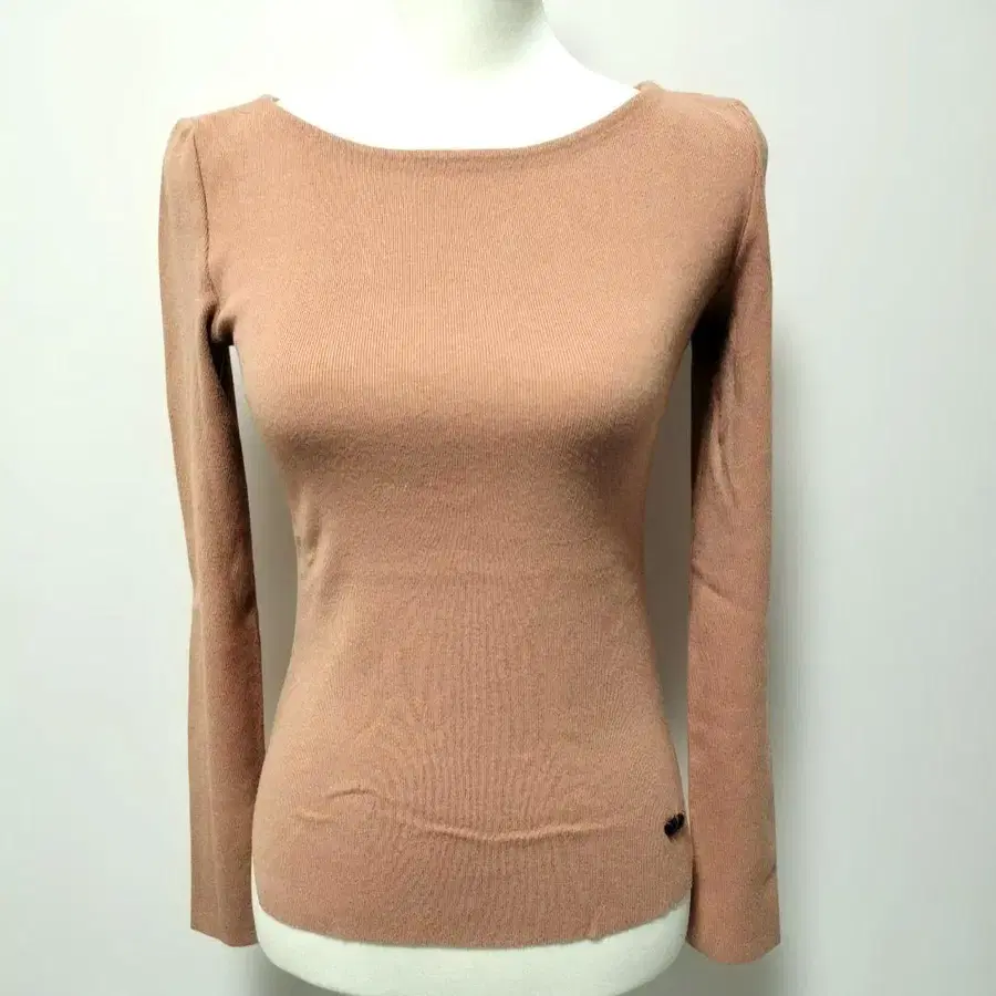 리브 편직의 심플한 타이트 핏 긴팔 니트, 핑크 베이지. 로고 포함.