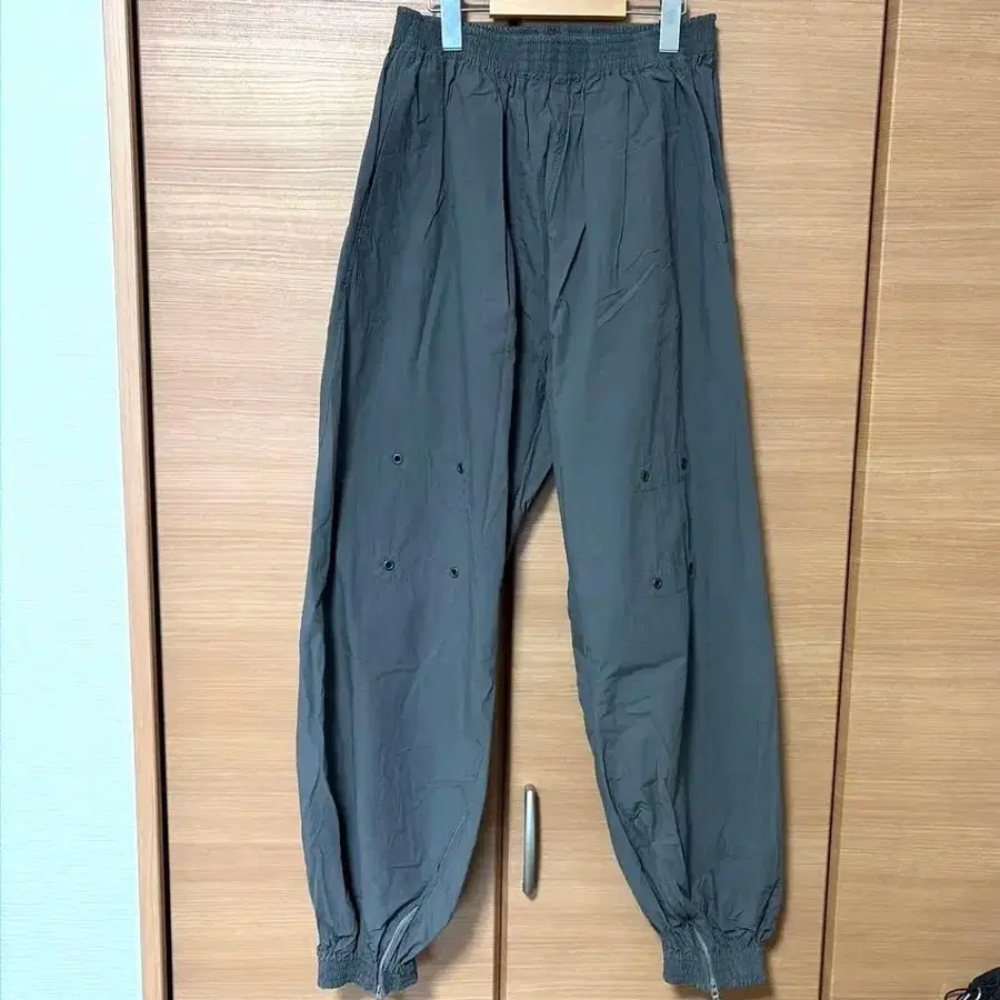 허리는 밴딩 사양이며, 무릎 부분에 아이렛을 배치하고 밑단 부분에는 지퍼를 달아 실루엣에 변화를 줄 수도 있습니다.