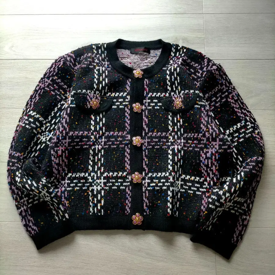 빈티지 구제 의류 꽃 버튼 트위드 자켓 체크 무늬 가디건