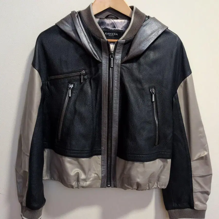 여성용 가죽 자켓 후드 부착 블랙과 그레이