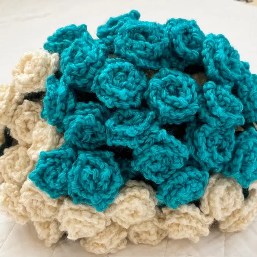 자동 번역되었어요. 원문보기터콰이즈 블루와 아이보리 2가지 색상의 플라워 담요입니다. 장미 1개의 크기는 5cm입니다. 중앙을 들어 올려 안으면 꽃다발처럼 됩니다. 담요로, 또는 인테리어 소품으로, 선물 등으로 어떠신가요?