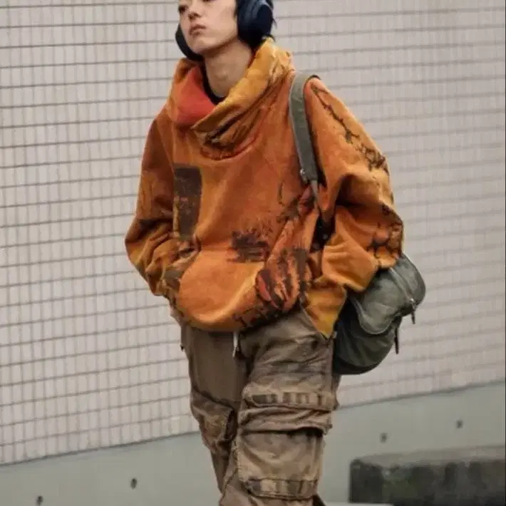 Julius 7 오렌지 페인트 후디 풀오버 데미지