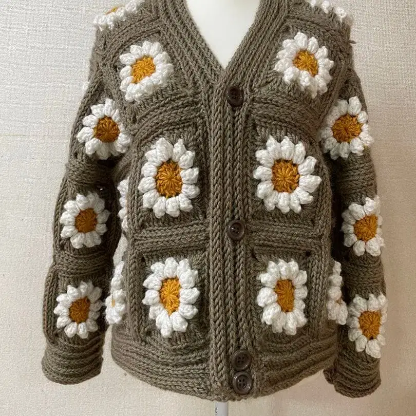 할머니 네모 데이지 모티브가 특징인 카페 오 레 니트 가디건