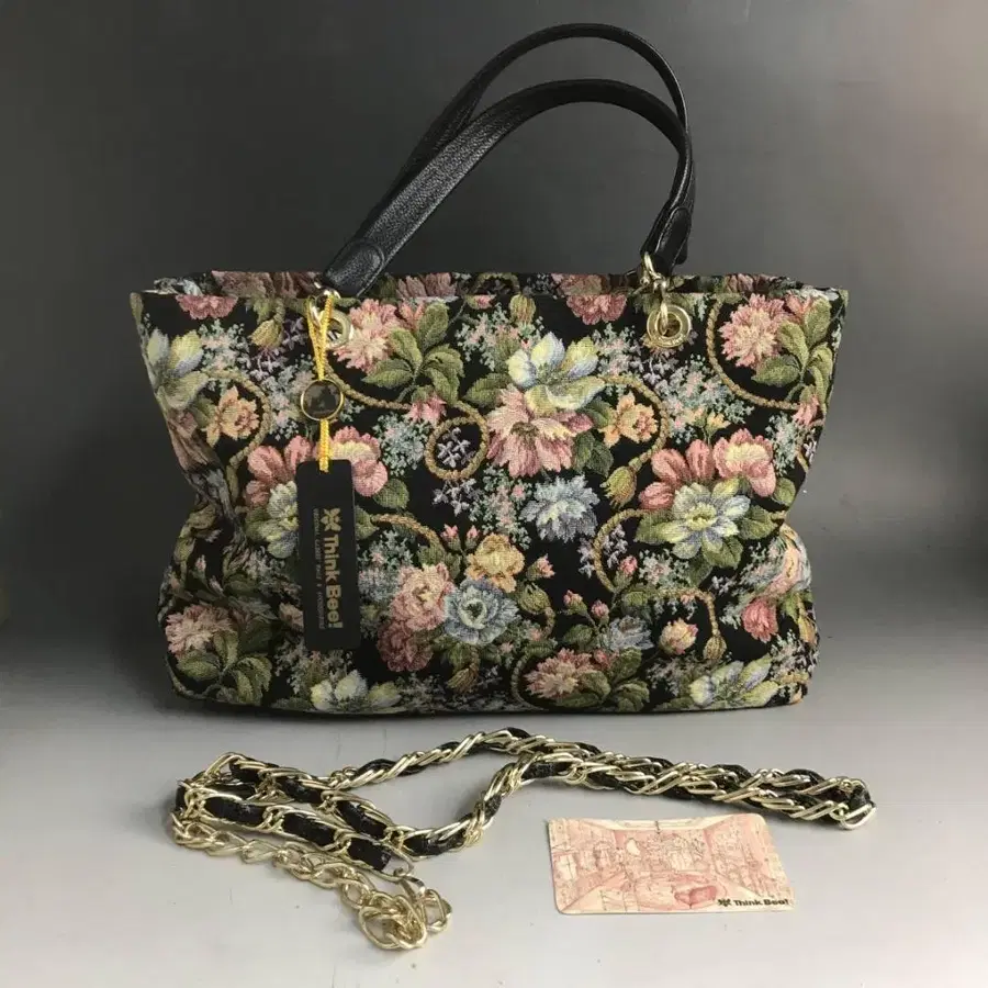 택 포함 Think Bee! 싱크비 토트 핸드 백 고블랑 직조 꽃무늬 자수 가죽 천연 가죽 사용 가방 여성용 블랙
