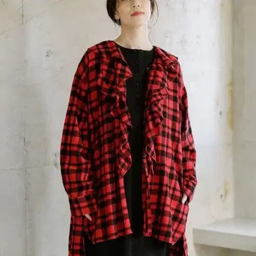 [ 카네하라 히로카즈 콜라보 ] 가는 골 체크 모듬 프릴 튜닉 셔츠