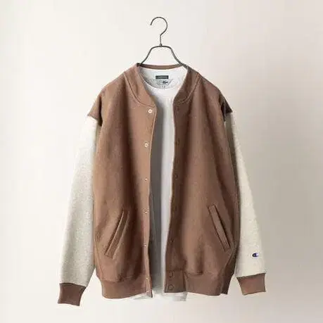 소매와 몸판의 배색을 절개한 바시티 자켓 스타일의 마무리.