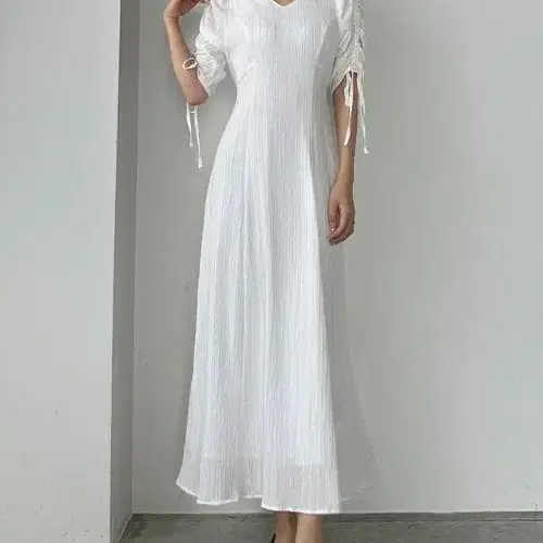5 양류 개더 슬리브 V넥 원피스 [ 페치 스커트 세트 ]