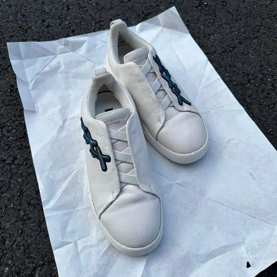 화이트 베이스에 빅 XXX 자수가 돋보이며, 발이 단번에 주인공이 되는 디자인