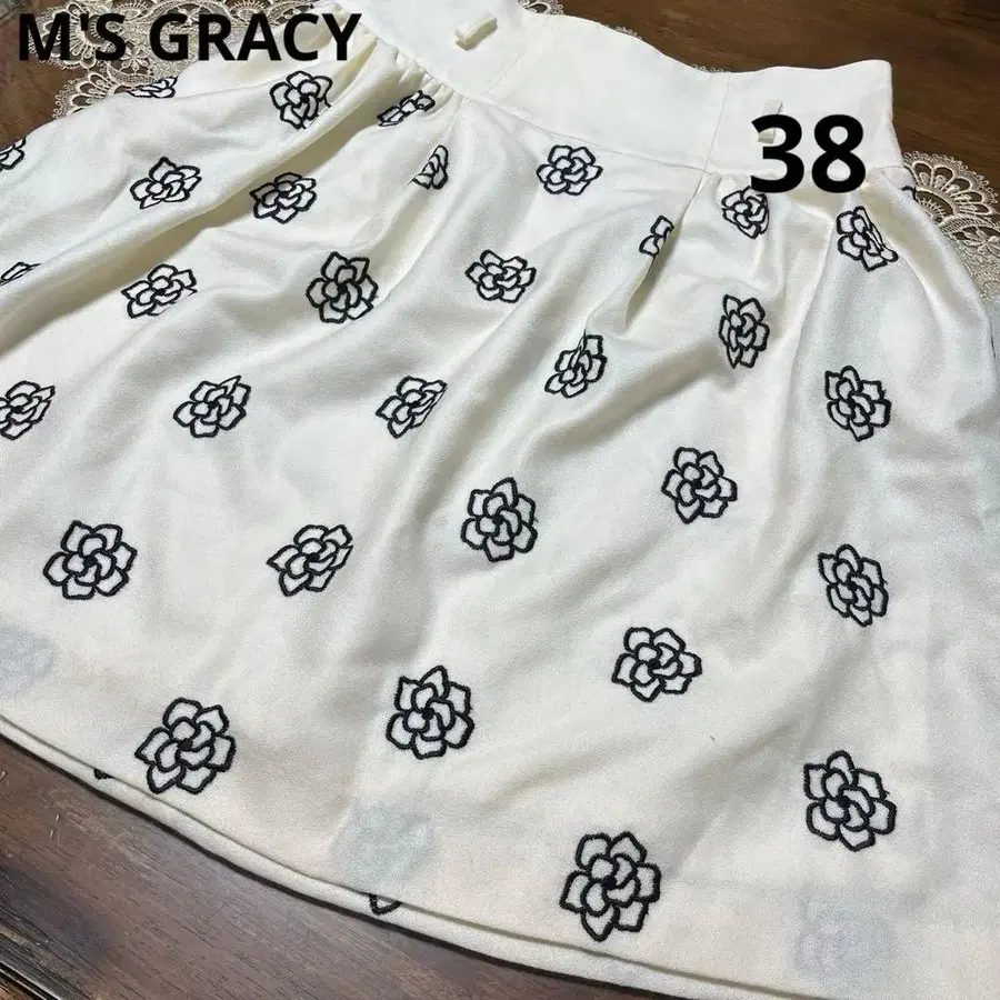 새상품급 엠즈 그레이시 사이즈 38 까멜리아 자수 플레어 스커트