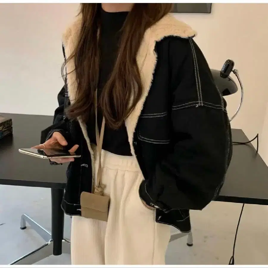 보아 자켓 [ M ] 블랙 오버 사이즈 자켓 안감 퍼 데님