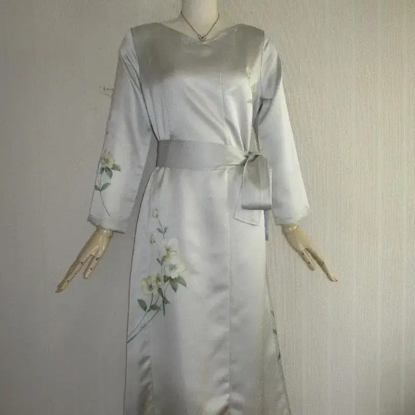 ♥ 약간 푸른빛이 도는 실버 색상의 순수 실크 원단에, 부용꽃을 그린 그림체의 드레스입니다.