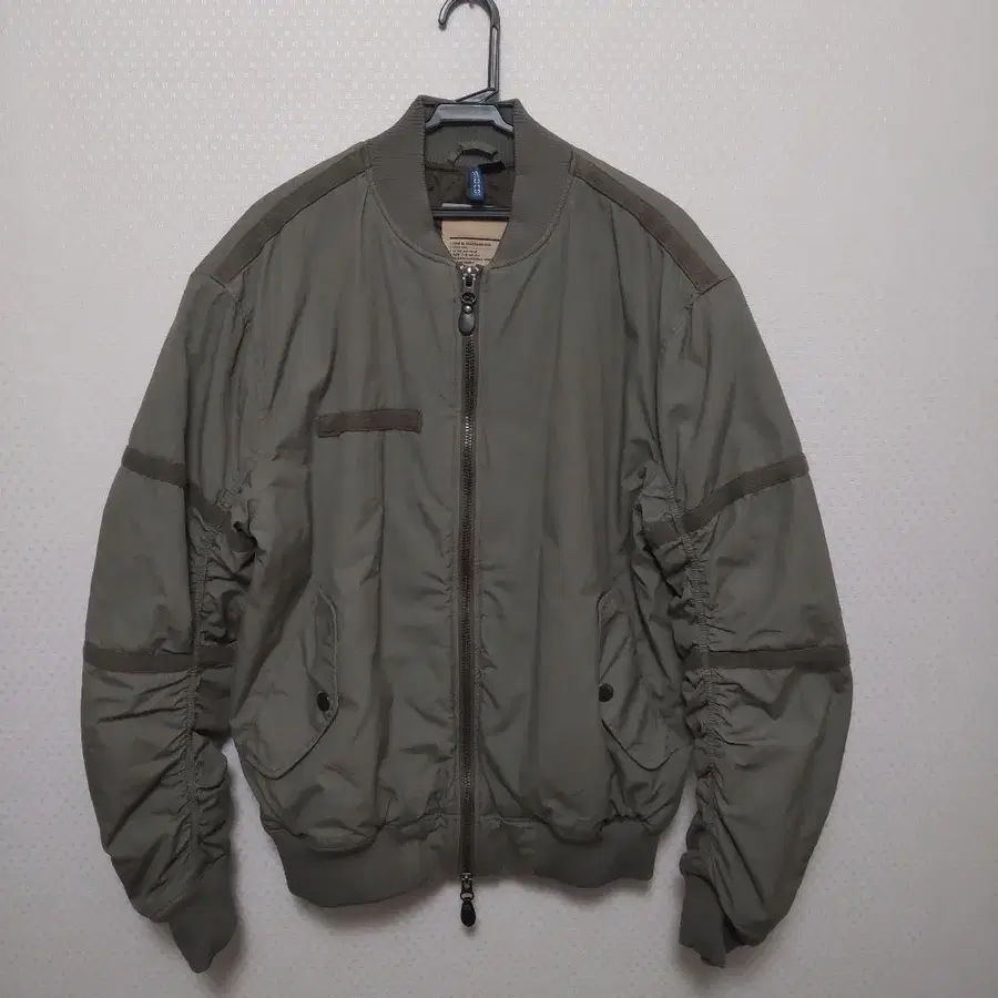올리브/카키 색상의 MA-1 스타일 자켓, 겉감 코튼 소재로 내구성이 높습니다.