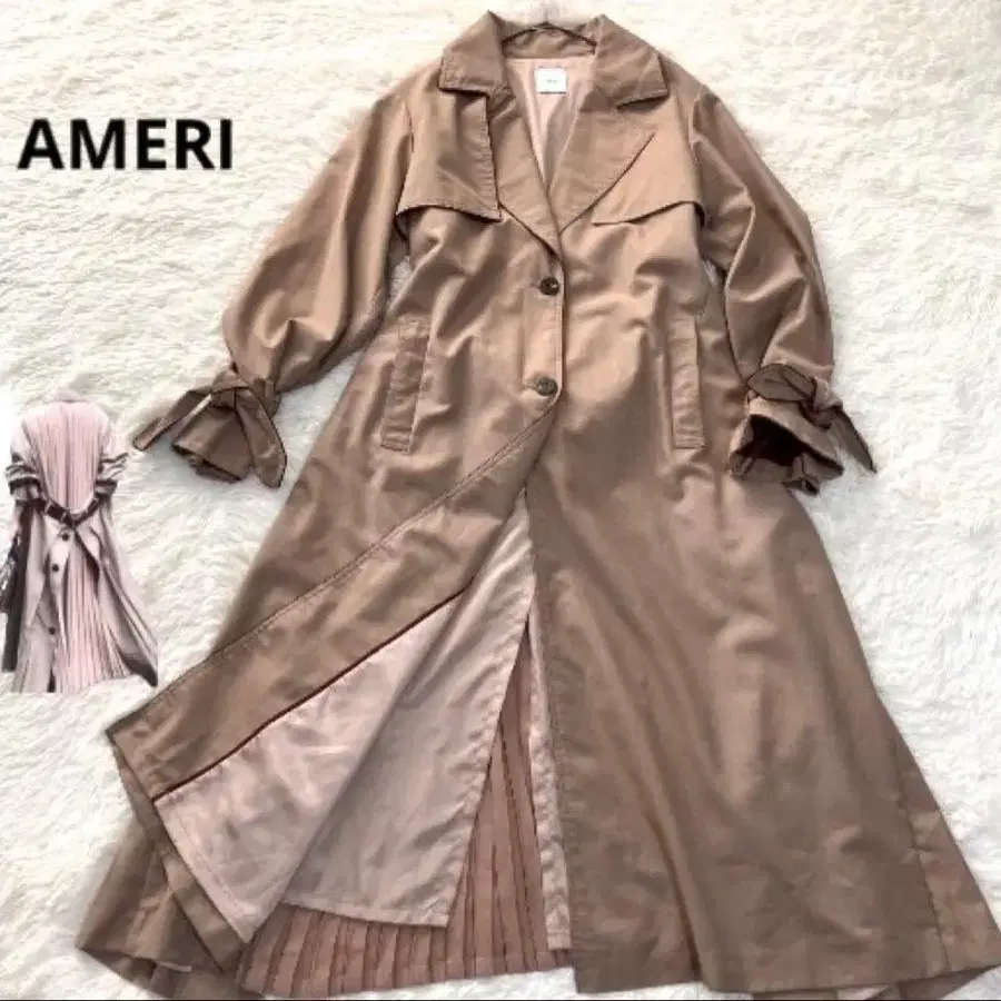 새상품급 AMERI 백 플리츠 레이어드 롱 트렌치코트 베이지 F 소가죽