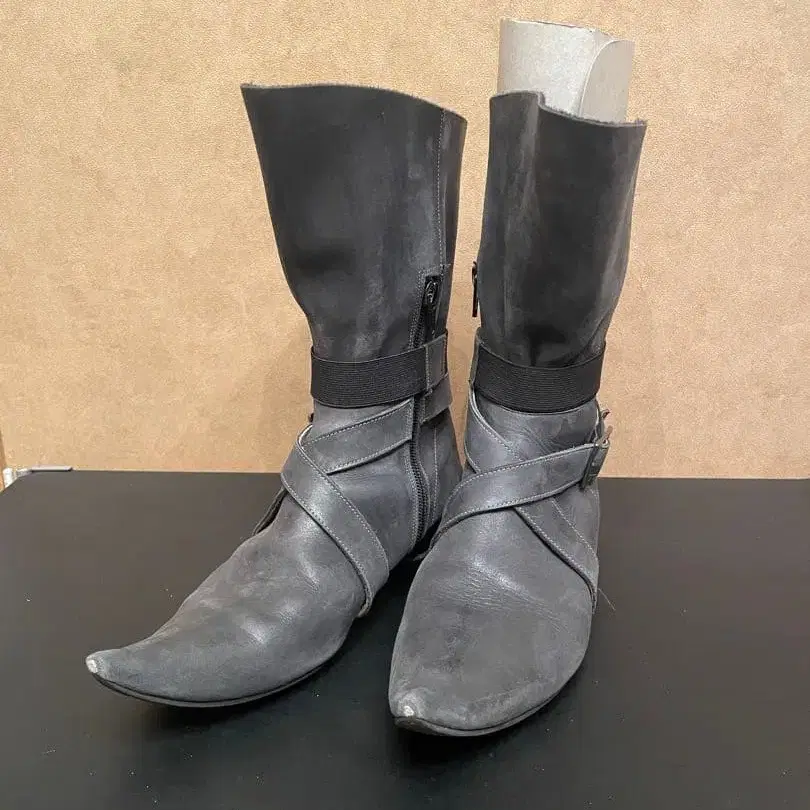 히미코 블랙 그레이 가죽 부츠
