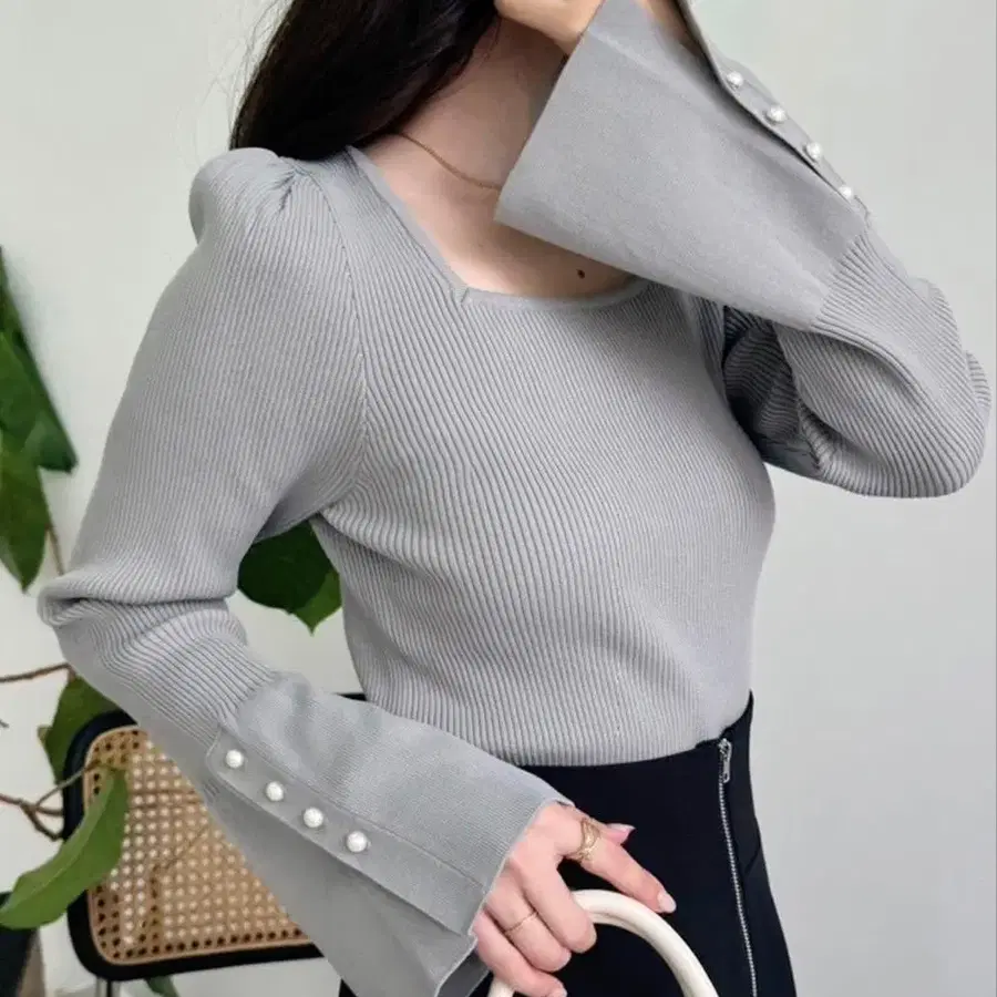 NICE CLAUP 펄 버튼 벨 슬리브 니트 오피스 캐주얼