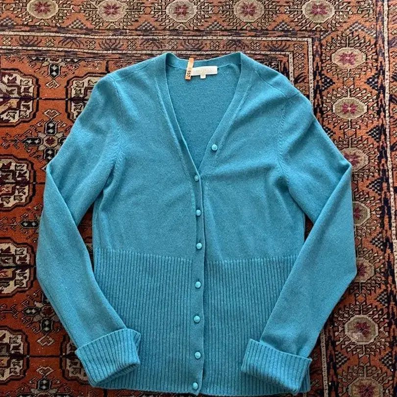 캐시미어 100% 터콰이즈 블루 V넥 가디건