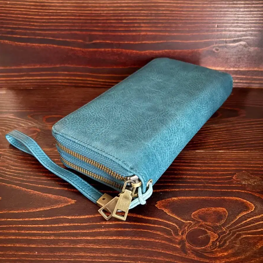 얼룩 염색 가공을 거친 선명한 블루칼라의 이탈리아 가죽을 사용한 더블 지퍼형 장지갑입니다.