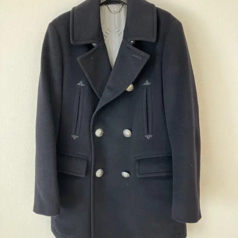 자동 번역되었어요. 원문보기더블 브레스트 코트, 실크 터치 라이닝에 Daks 로고 포함.