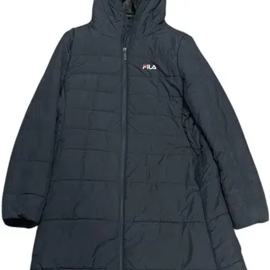 후드 부착 롱 기장 다운 자켓, 퀼팅 디자인으로 보온성이 뛰어납니다.