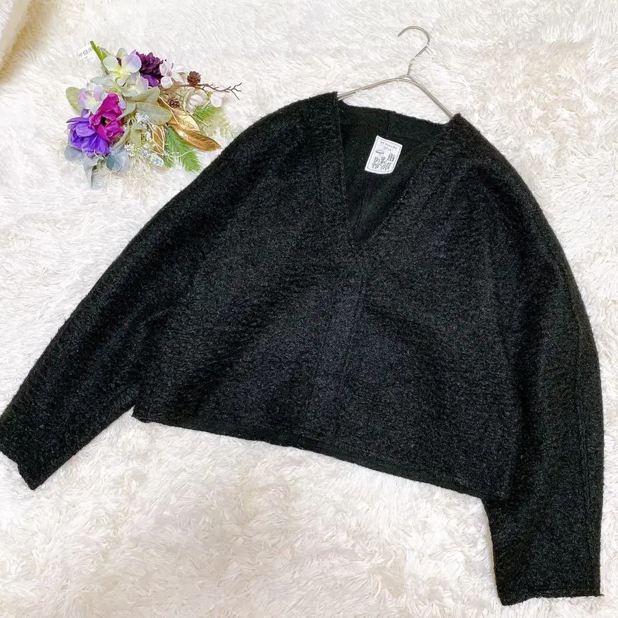 블랙 부클레 V넥 노카라 자켓, 크롭 기장으로 스타일리시합니다.