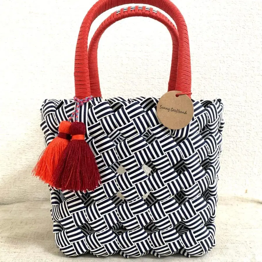 바스켓백 크라프트밴드 돌담 네이비 화이트 스트라이프 빨간 핸들 태슬 포함