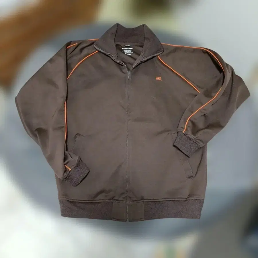 자동 번역되었어요. 원문보기지퍼가 달린 브라운 저지, 오렌지 악센트가 특징.