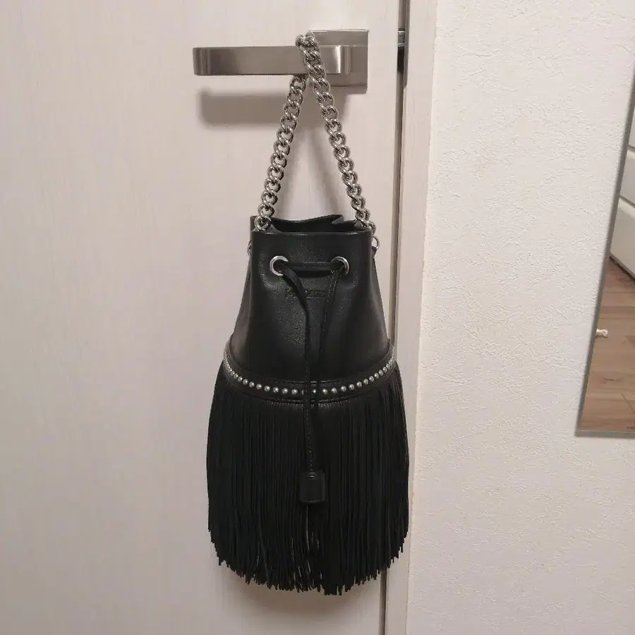 자동 번역되었어요. 원문보기프린지 장식의 블랙 가죽 숄더백.
