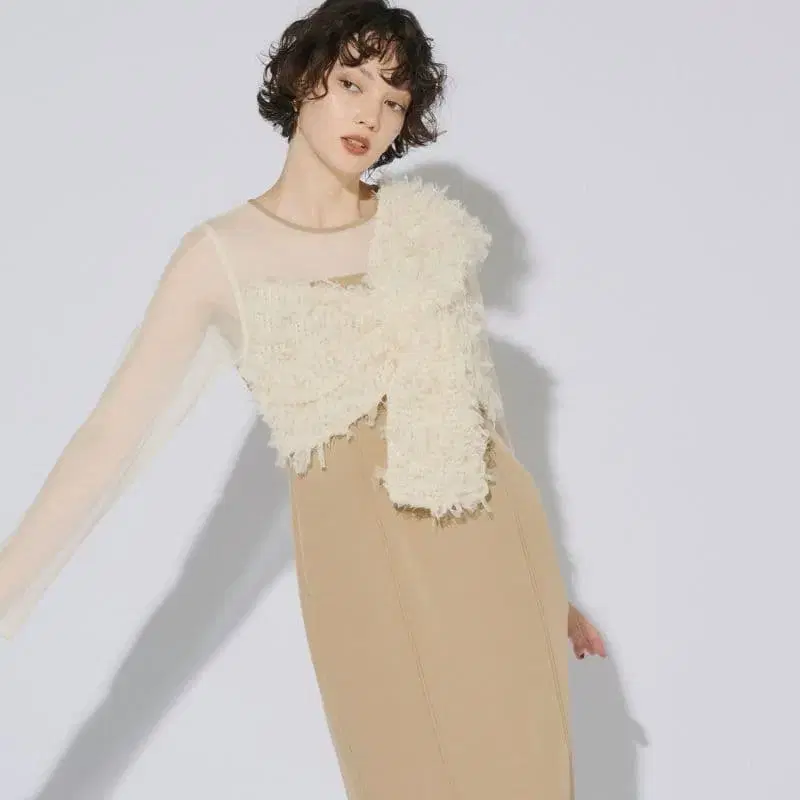 베이지 쉬폰 프릴 롱 드레스