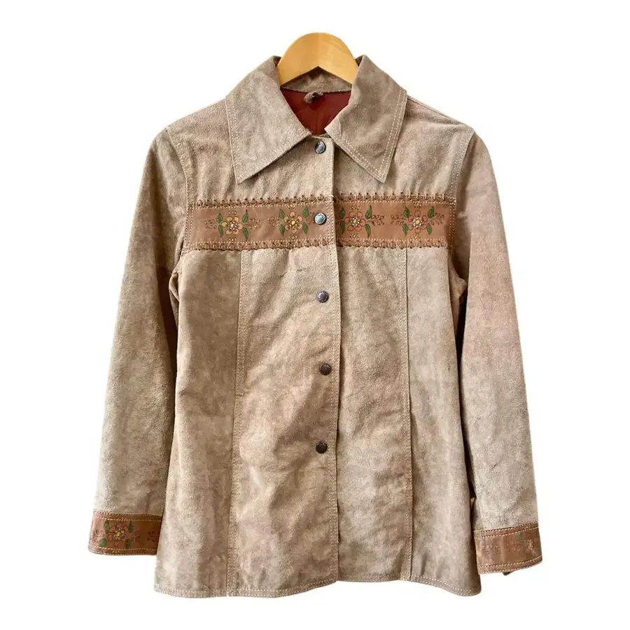빈티지 멕시코제 스웨이드 가죽 자켓입니다. 부드러운 스웨이드 가죽에, **가죽으로 만든 꽃무늬 디자인 (가죽 플라워)**이 분위기 있는 한 벌입니다. 멕시코제 특유의 핸드크라프트 느낌이 있으며, 다른 곳에서는 찾을 수 없는 빈티지 마니아에게는 놓칠 수 없는 아이템입니다. 사이즈 표기는 13이지만, 실측치수에서 여성용 S~M 상당 혹은 슬림한 분에게 추천합니다. 사이즈 (실측치수) 기장: 약 65cm 가슴 너비: 약 46cm 어깨 너비: 약 41cm 소매 길이: 약 56cm 빈티지 제품이므로, 스웨이드 특유의 스크래치와 사용감 있음. 큰 데미지는 없으며, 구제 의류에 익숙한 분이라면 문제없이 착용 가능합니다 ♪ 빈티지 멕시코제 스웨이드 가죽 가죽 꽃무늬 / 플라워 디자인 하나뿐인 느낌 있음 데님이나 슬랙스와의 궁합도 좋으며, 걸치기만 해도 분위기가 나는 자켓입니다 ♪ 빈티지 구제 의류에 이해가 있는 분, 꼭 검토해 주세요. #구제 의류show 다른 희귀 아이템도 판매 중입니다. 부디 봐 주세요 ♪ 사이즈 - M