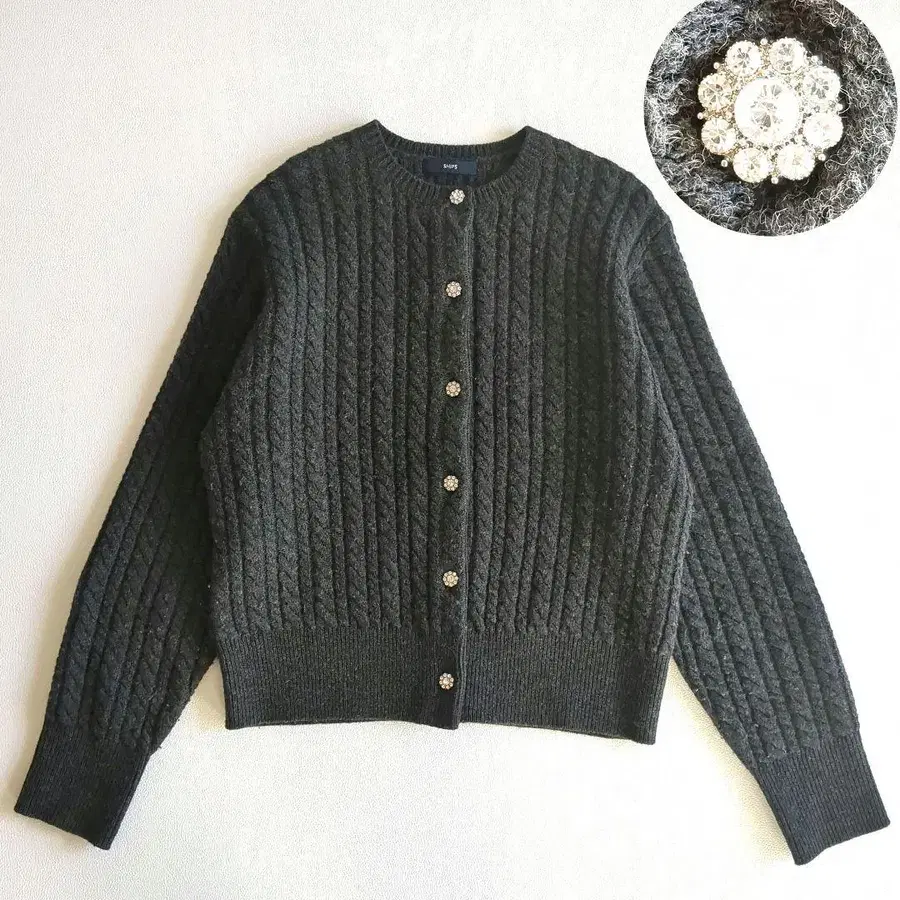 쉽스 니트 가디건 케이블 짜임 꽃 비쥬 버튼 그레이