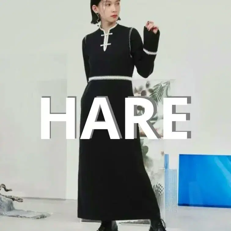HARE 차이나 버튼 니트 원피스 블랙 중화 하레